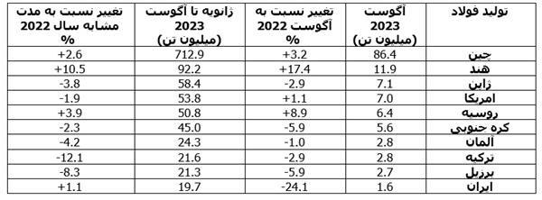 به گزارش فولاد ایران، در این بین تولید چین ماه آگوست 3.2 درصد رشد داشته 86.4 میلیون تن شنیده شد. تولید هند 17.4 درصد رشد داشته 11.9 میلیون تن شد و تولید فولاد ژاپن 2.9 درصد افت سالانه داشته 7.1 میلیون تن ثبت شد.